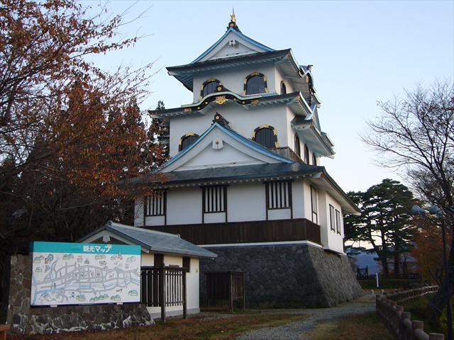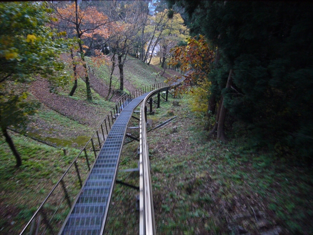 平安の風わたる公園(横手市)の次に行ったのが湯沢市稲庭町にある稲庭城。 当然近い訳がない・・・。公園を出たのも遅かったが結局着いたのは4時近く。 なんとかギリギリでスロープカー(東北最大級らしい)に乗せてもらい山頂にある稲庭城へ。歩いても行けるようだが時間と体力のある方はどうぞって感じ。スロープカーでも急勾配なのが分かる。 城自体はやはり模擬で今昔館という資料館になっている。 黄金の間というものがあって「豊臣秀吉とは関係ありません」とあるが、まぁ書いていなくても無関係だと分かる。(金箔を貼る技術の粋を結集したものらしい。つまり最近作ったって事な訳で・・・) 他に稲庭うどんに関するものや、小野寺氏に関するものが展示されている。最上階はやはり展望台になっていた。丁度夕日が落ちるところだったがコンパクトなデジカメしか持って来ていないし・・・。 まぁ、ぼちぼち最終のスロープカーの時間になるので滞在時間は30分位しかなかったし・・・。